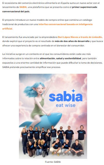 El ecosistema del comercio electrónico alimentario en España suma un nuevo actor con el lanzamiento de SABIA, una plataforma que se presenta como el primer supermercado conversacional del país. Enlace al artículo en Ecommerce News – 13 de febrero de 2026