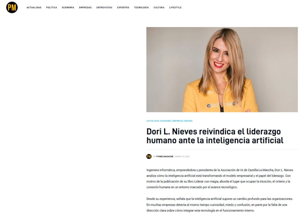 Ingeniera informática, emprendedora y presidenta de la Asociación de IA de Castilla-La Mancha, Dori L. Nieves analiza cómo la inteligencia artificial está transformando el modelo empresarial y el papel del liderazgo. Enlace al artículo en Pymes Magazine – 10 de marzo de 2026